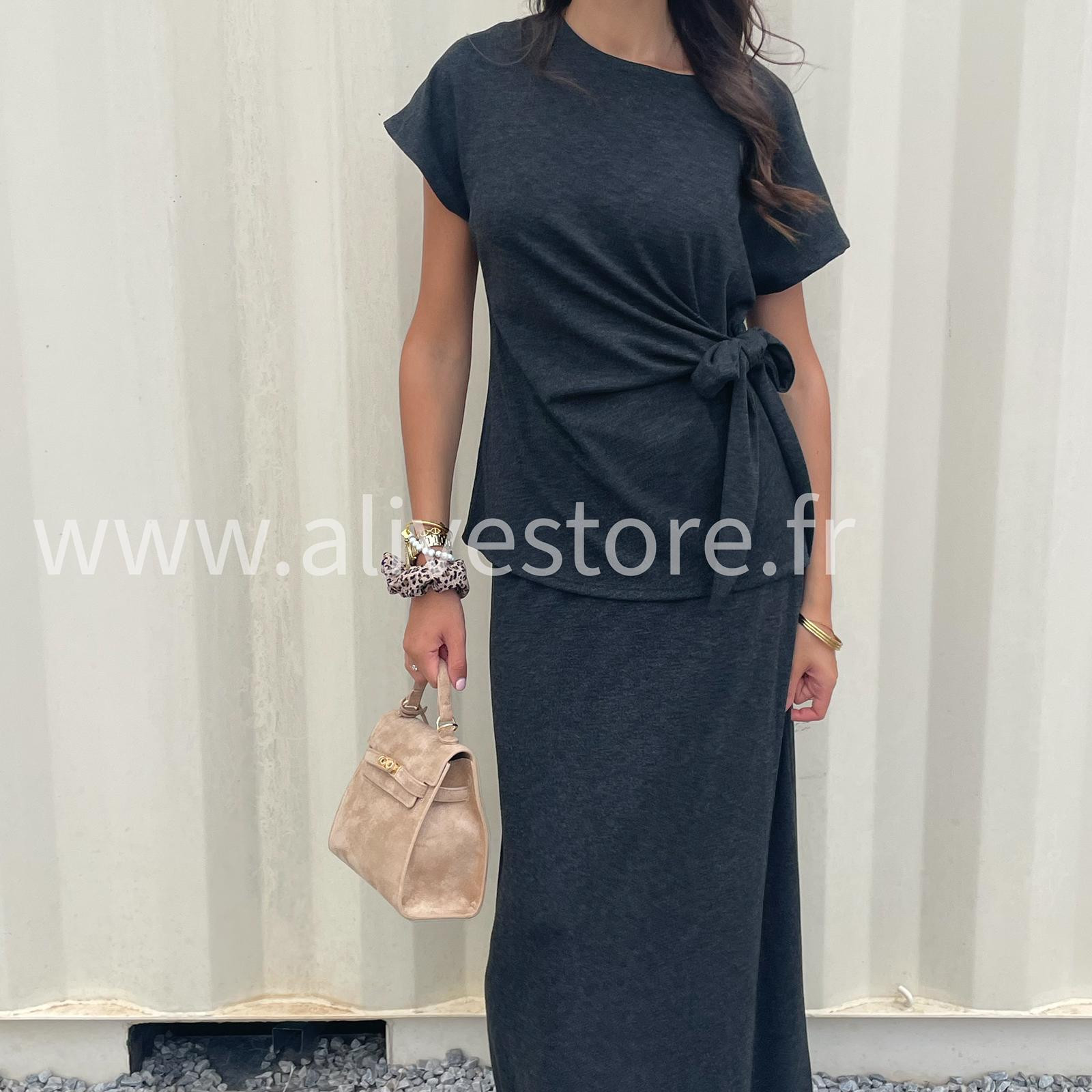 COMPOSÉ D’UNE JUPE LONGUE ET D’UN HAUT À LIEN NOUÉ SUR LE CÔTÉ, IL ALLIE CONFORT ET STYLE.