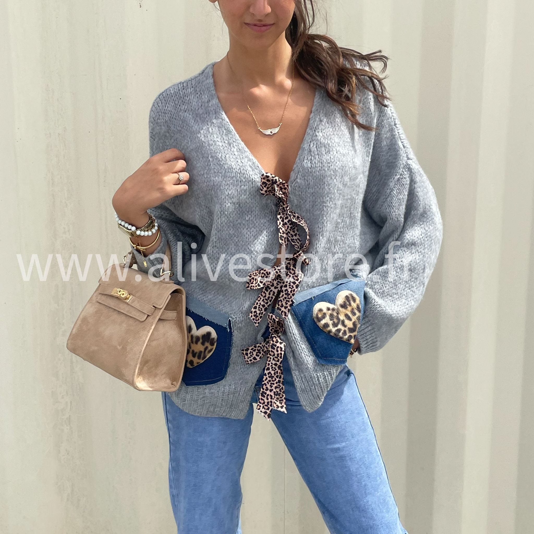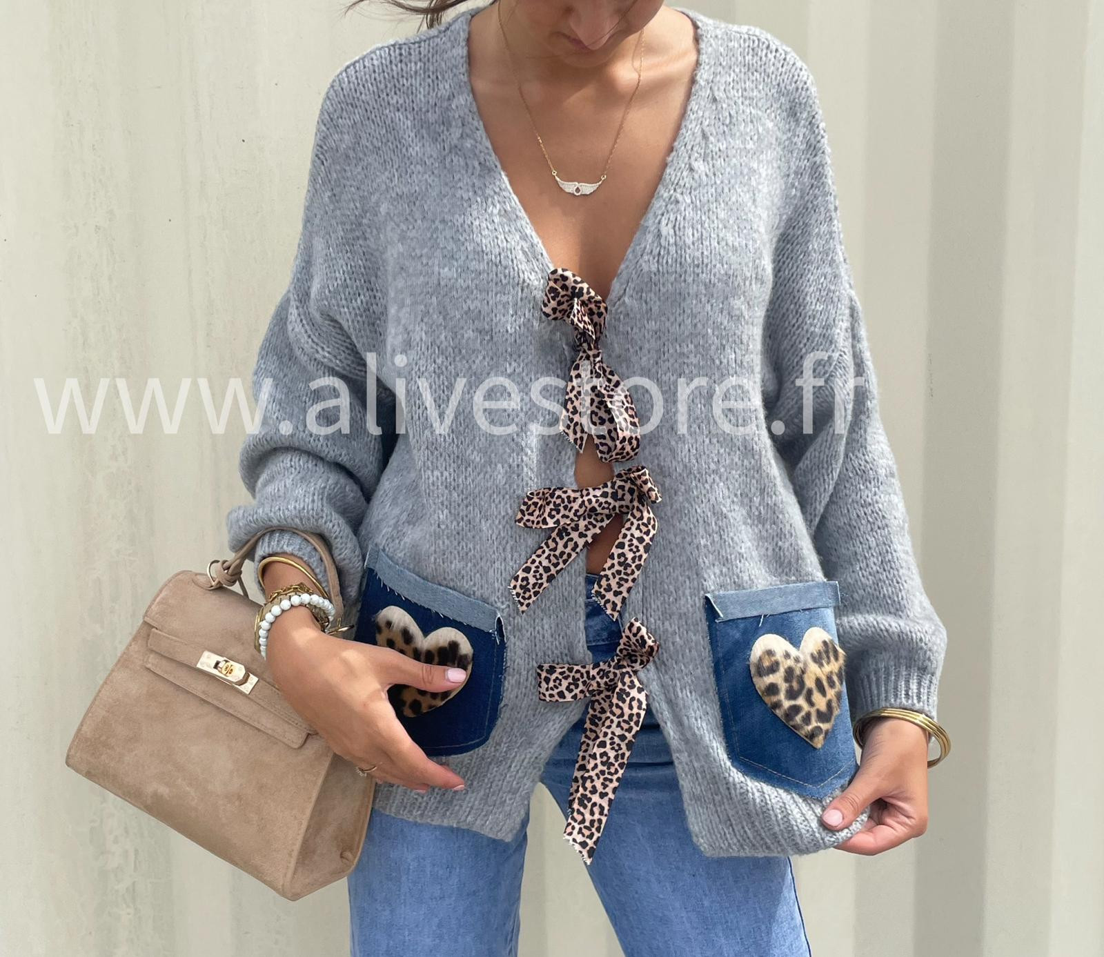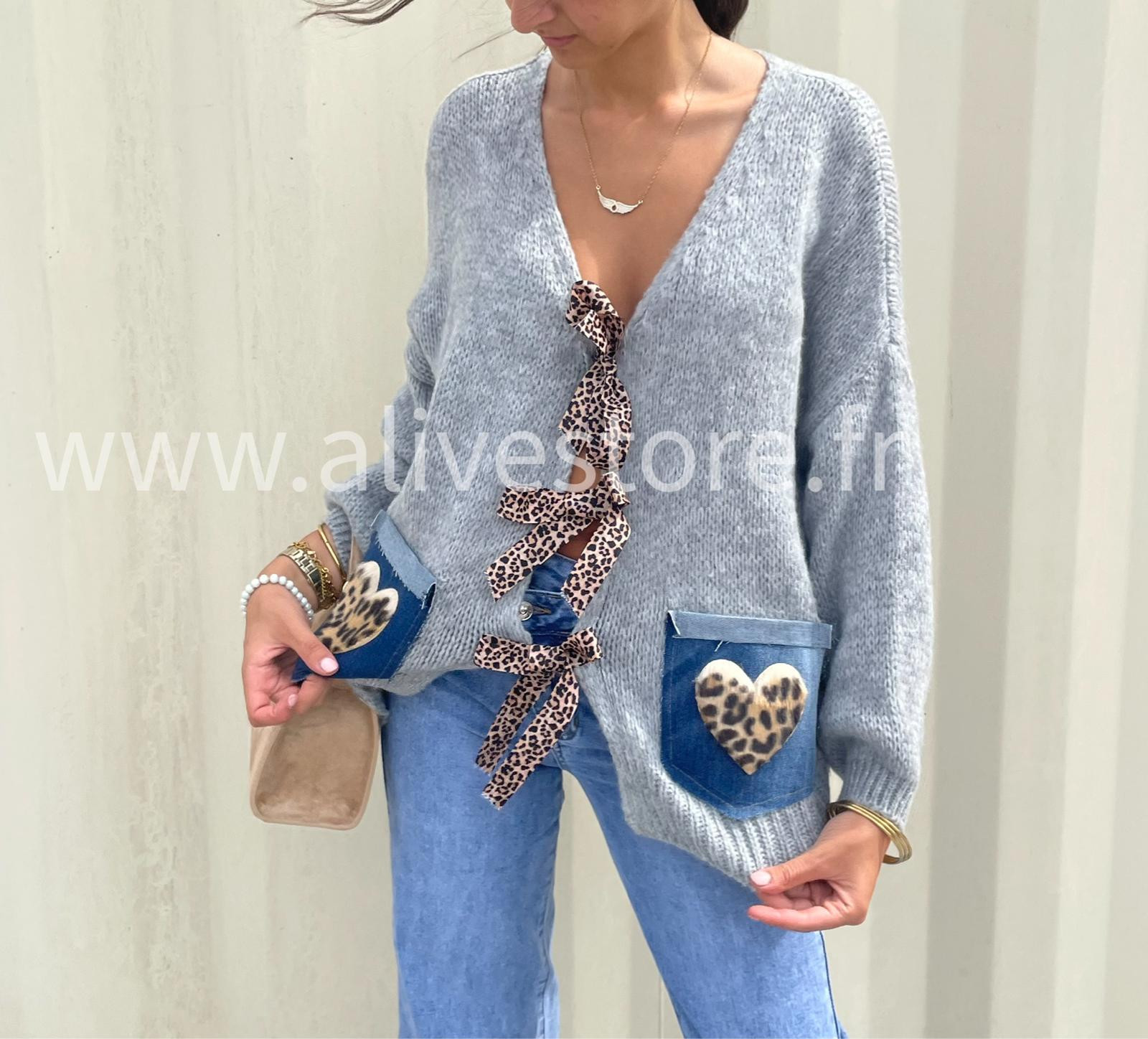 AVEC SA COUPE OVERSIZE, IL OFFRE UN LOOK DÉCONTRACTÉ MAIS ULTRA STYLÉ. SES LIENS DEVANT ET SES POCHES EN JEAN ORNÉES DE CŒURS LÉOPARD LUI DONNENT UNE TOUCHE UNIQUE ET AUDACIEUSE.
