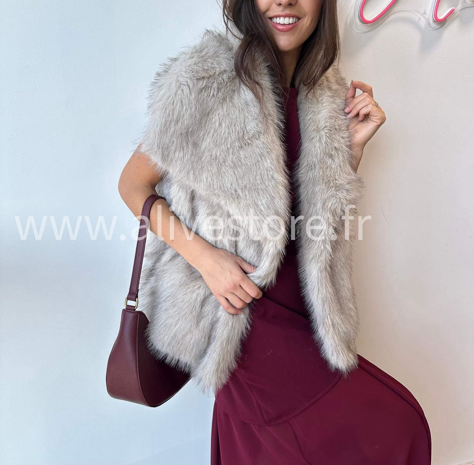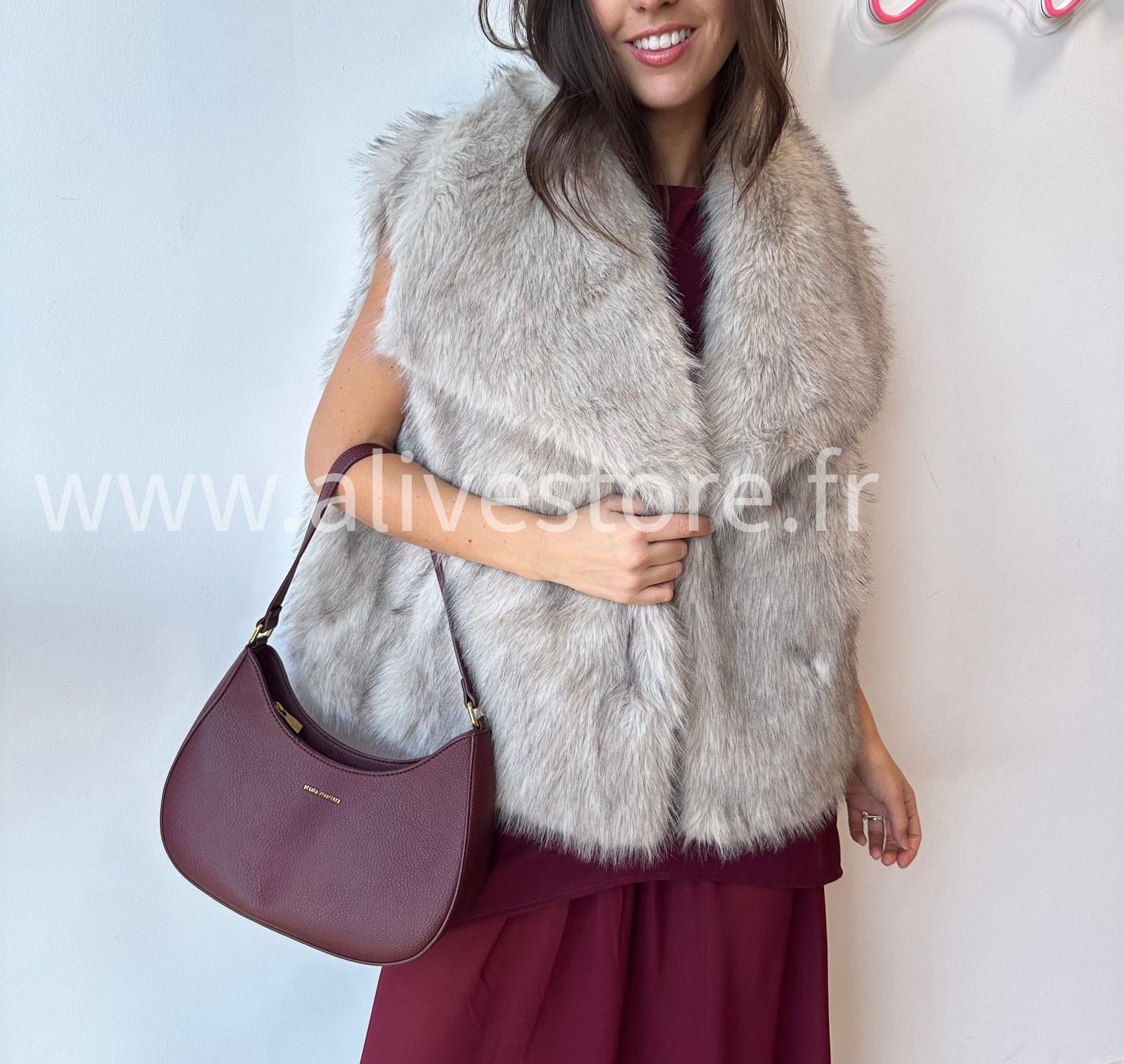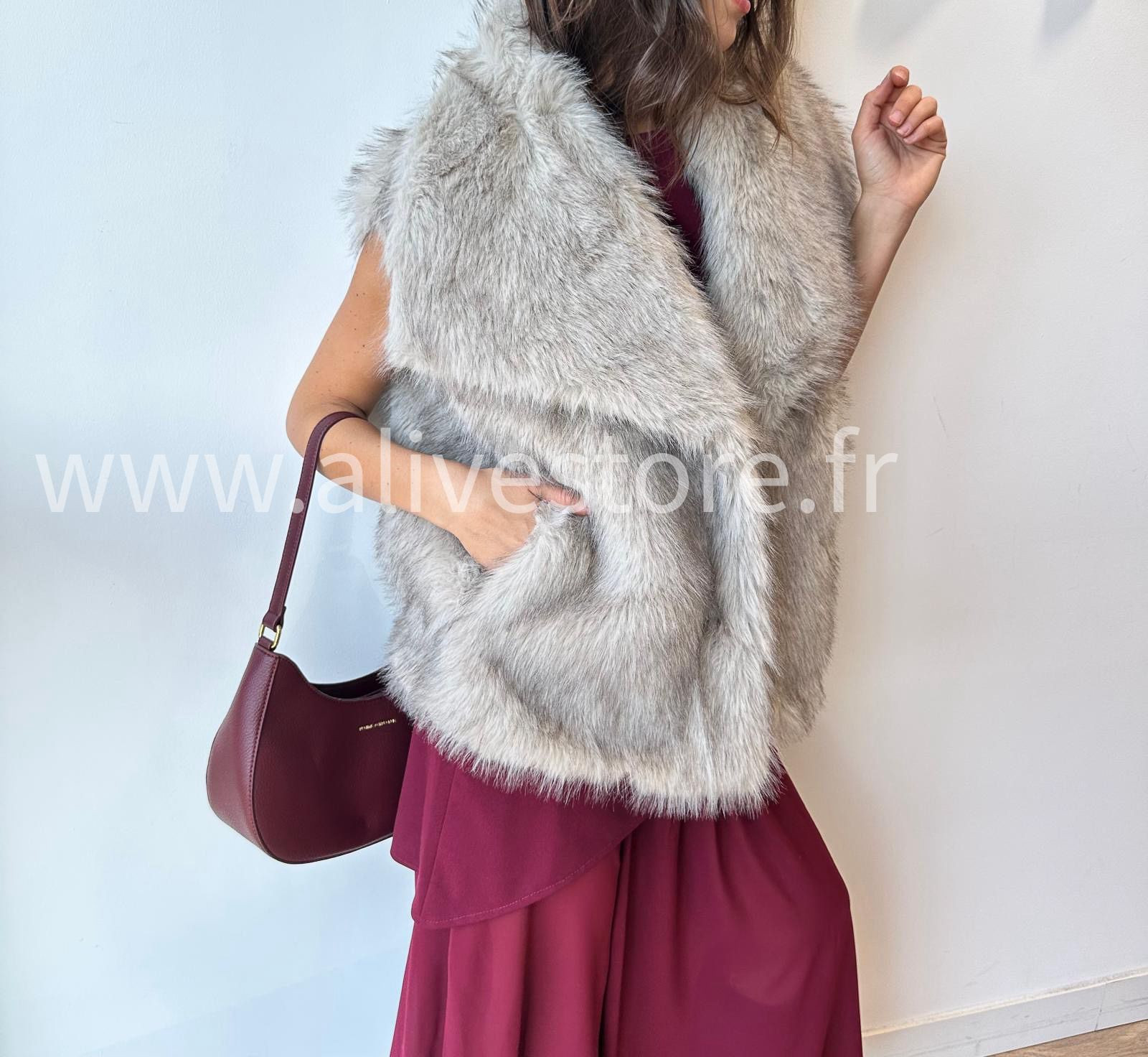 SANS MANCHES ET EN FAUSSE FOURRURE, ELLE SE PORTE FACILEMENT SUR UNE ROBE, UN PULL OU UNE CHEMISE.