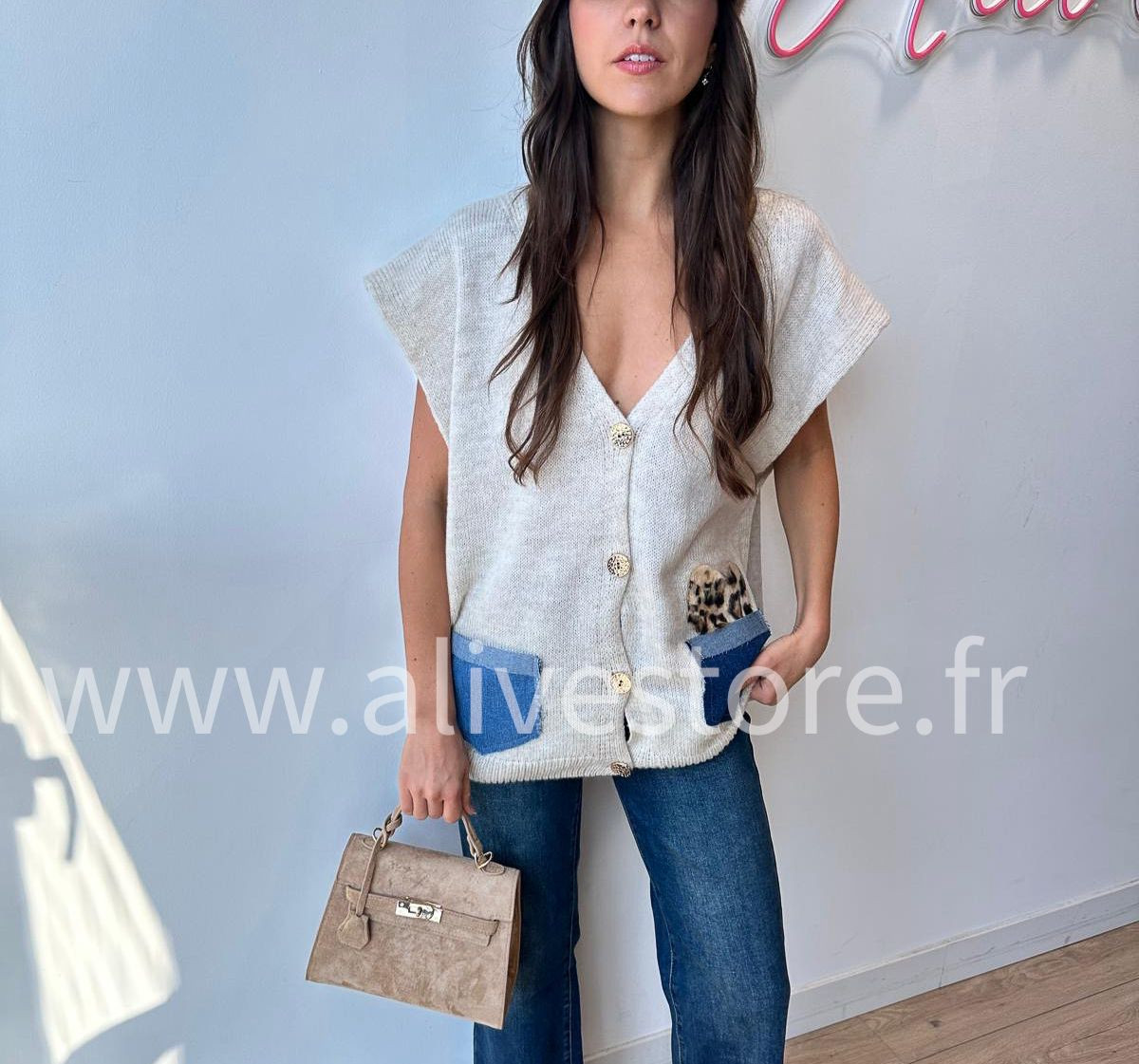 GILET BOUTONNÉ À POCHES DÉTAILS JEAN & LÉOPARD
