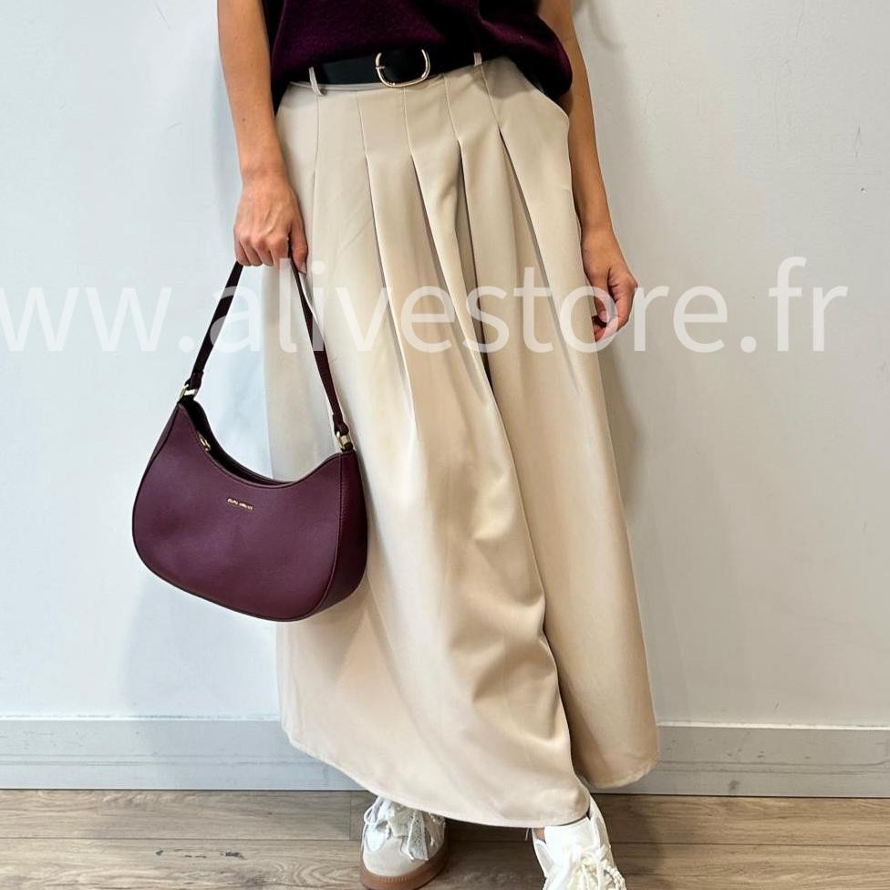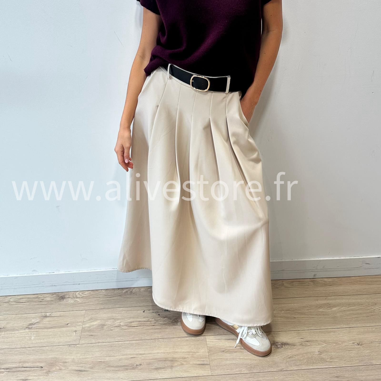 JUPE LONGUE FOURNIE AVEC SA CEINTURE NOIRE, DISPONIBLE EN BEIGE, NOIR ET MARRON. COUPE ÉVASÉE ET FLUIDE POUR UN LOOK CHIC ET CONFORTABLE.