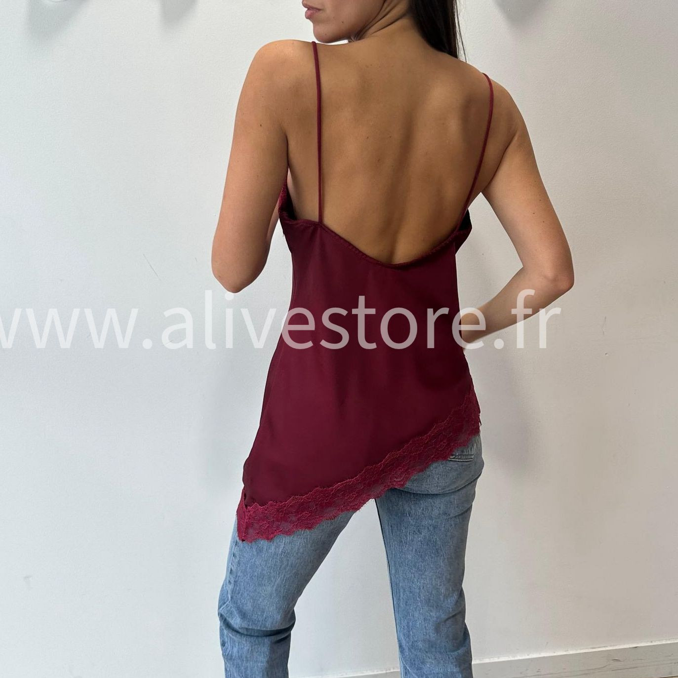 TOP FAÇON CARAMEL AVEC FINITIONS DENTELLE, BRETELLES FINES, MATIÈRE SATINÉE. DISPONIBLE EN BEIGE, BORDEAUX, NOIR. TAILLE UNIQUE.