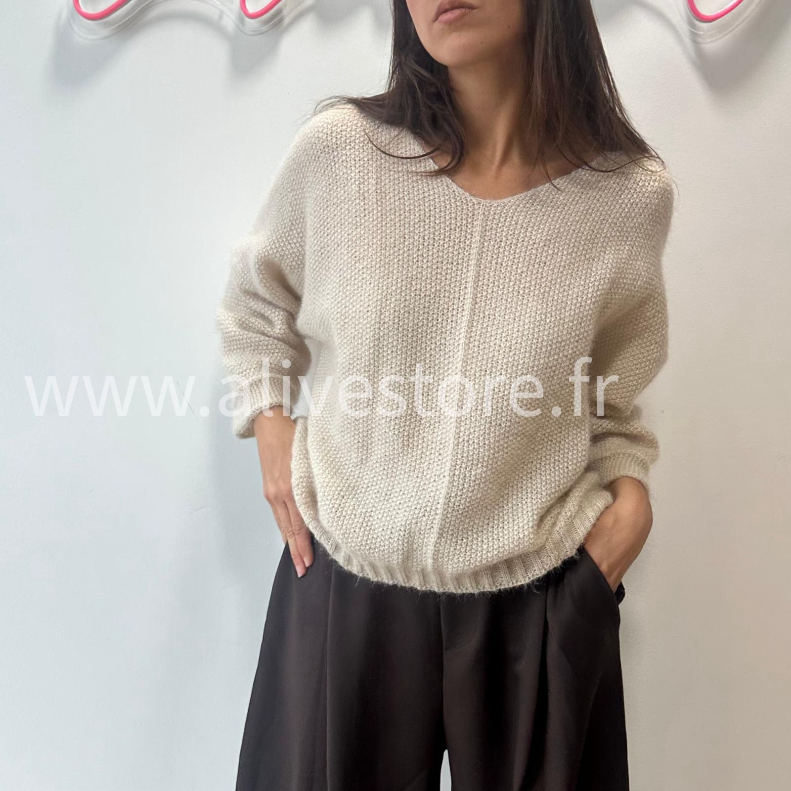 PULL MAILLE EPAISSE, COL V, COUPE DROITE ET CONFORTABLE. DISPONIBLE EN TAUPE, BLANC & NOIR. TAILLE UNIQUE.