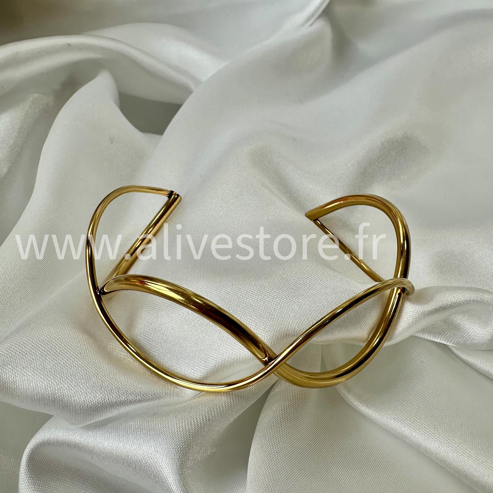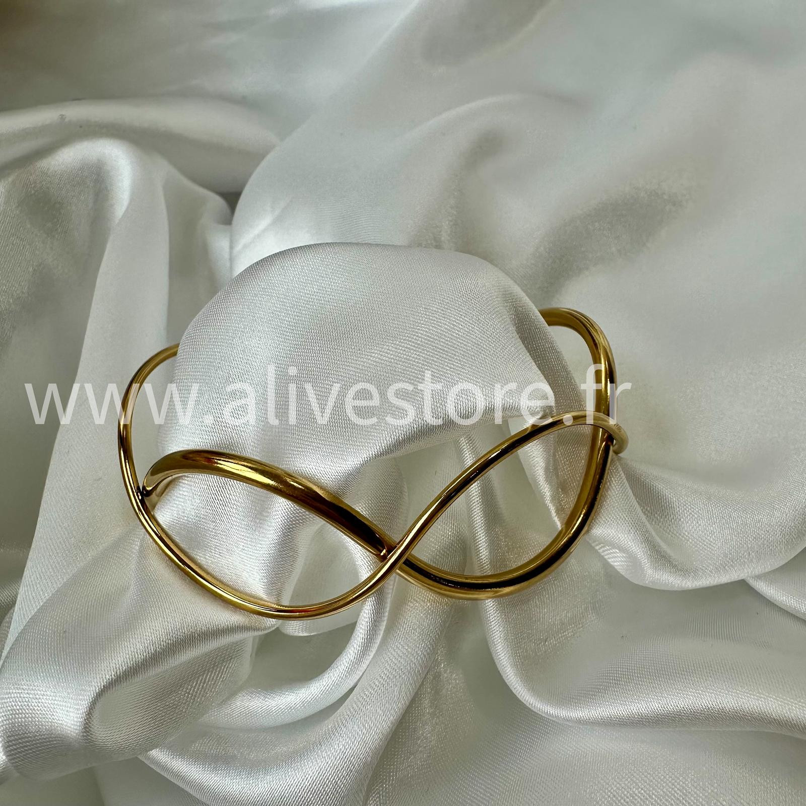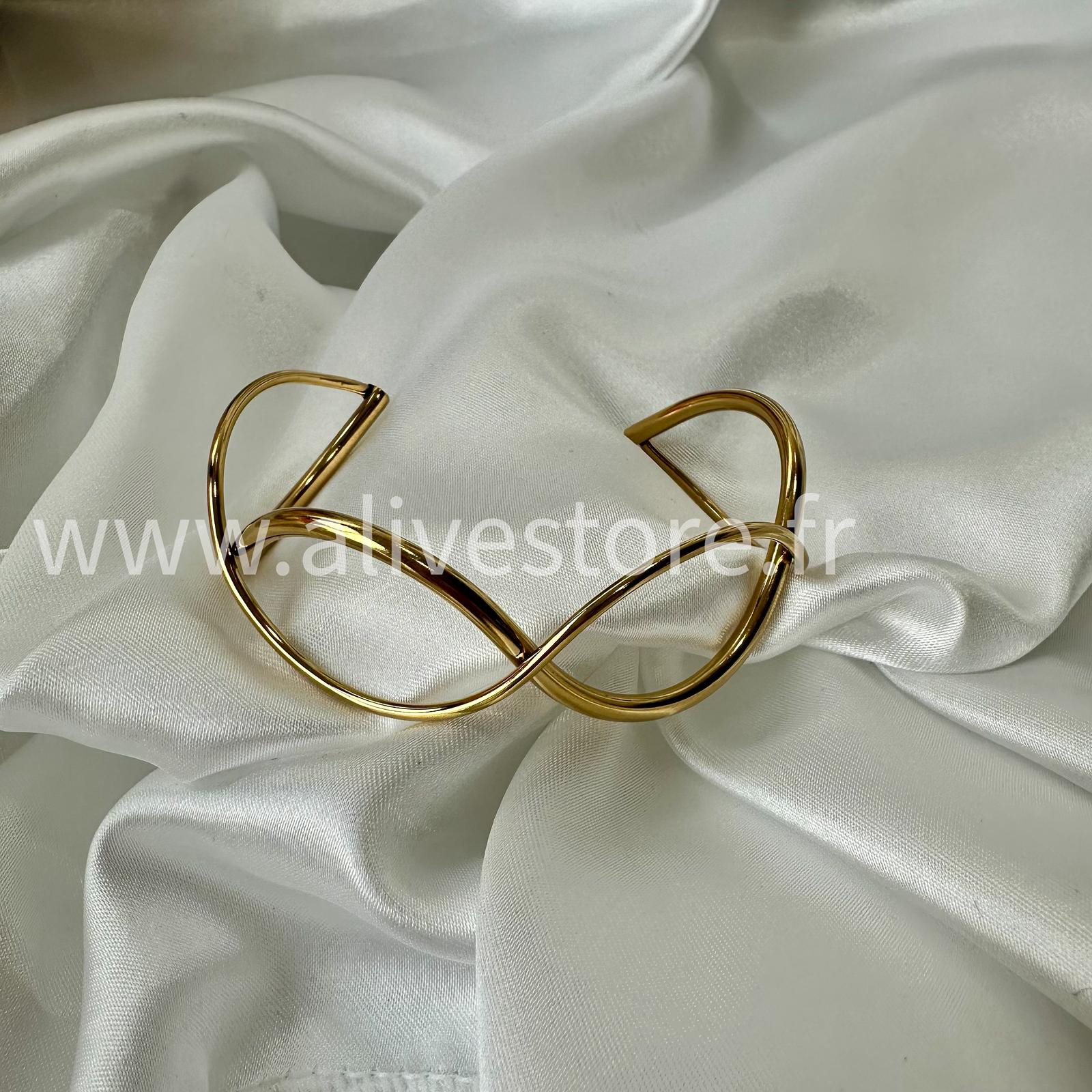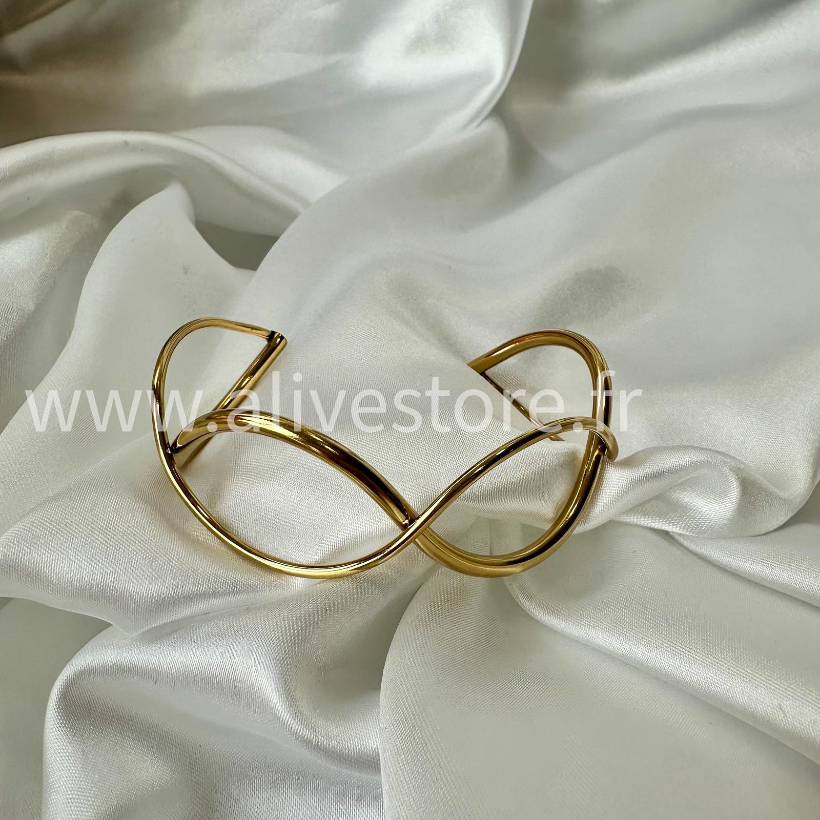 LE BRACELET LUNA SE DISTINGUE PAR SON DESIGN INFINI RAFFINÉ ET CONTEMPORAIN. SA FORME FLUIDE ET AÉRIENNE APPORTE UNE TOUCHE MODERNE ET CHIC À VOTRE POIGNET. CONÇU EN ACIER INOXYDABLE DORÉ, IL NE NOIRCIT PAS ET SE PORTE AU QUOTIDIEN COMME POUR DES OCCASIONS PLUS HABILLÉES. UN BIJOU INTEMPOREL, FACILE À ASSOCIER.