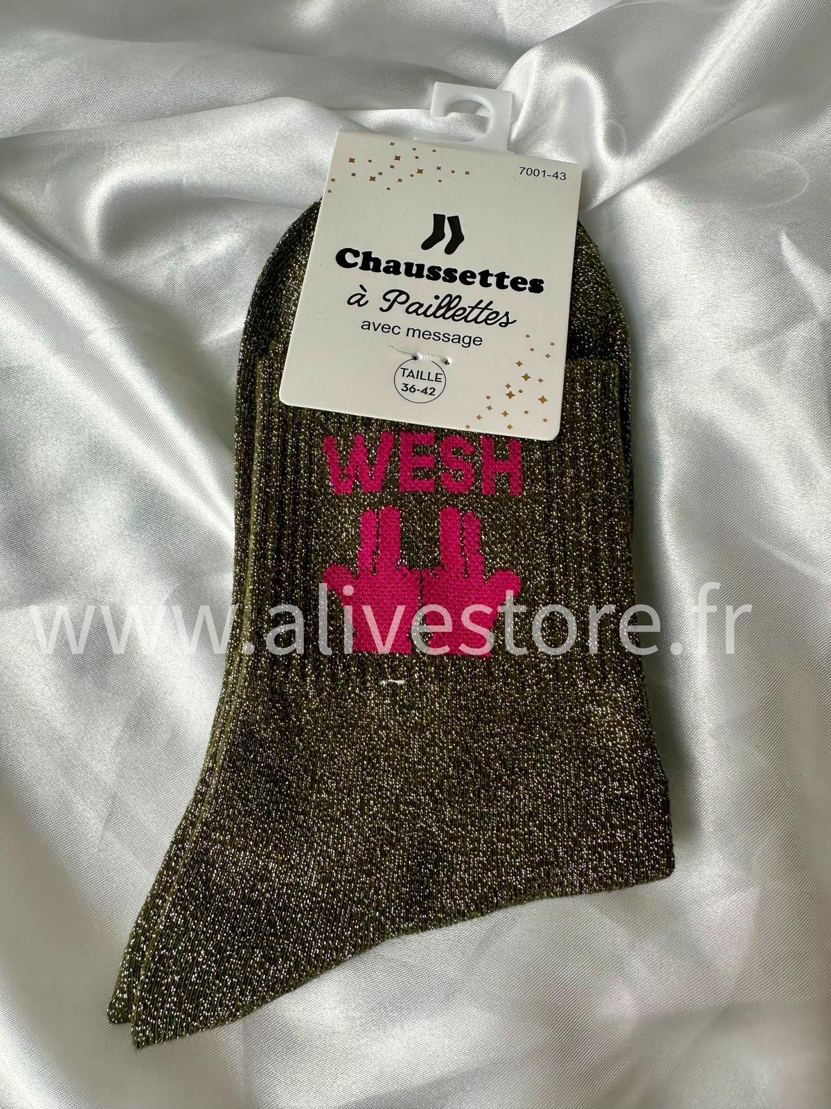 CHAUSSETTES PAILLETÉES TENDANCE AVEC MESSAGE WESH ET MOTIF MAINS POUR UNE TOUCHE FUN ET ORIGINALE