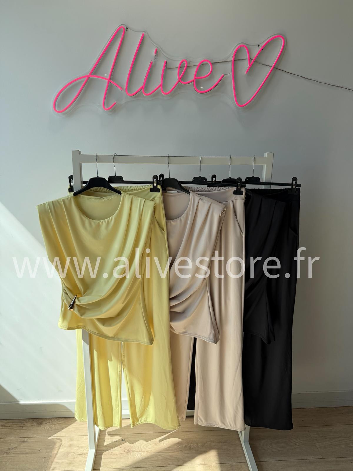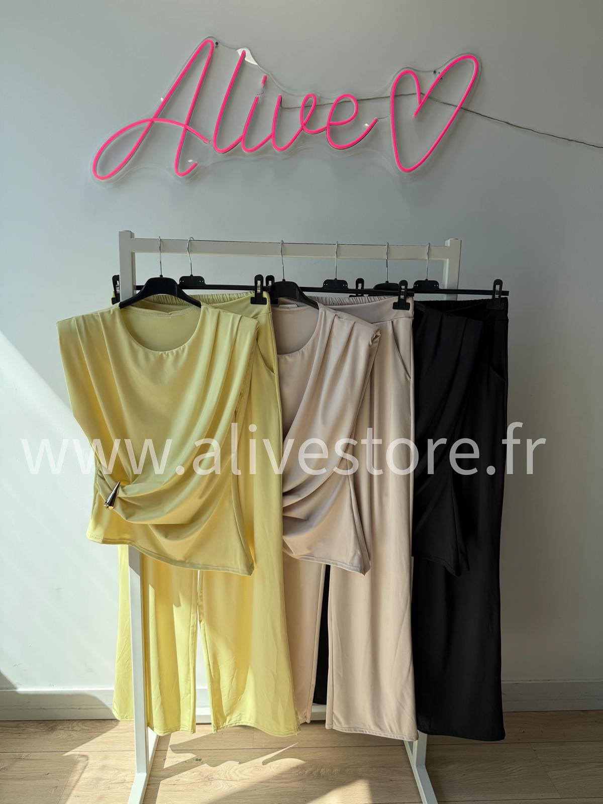 ENSEMBLE COMPOSÉ D’UN HAUT DRAPÉ AVEC DÉTAIL MÉTAL SUR LE CÔTÉ ET D’UN PANTALON LARGE POUR UN LOOK MODERNE ET ÉLÉGANT